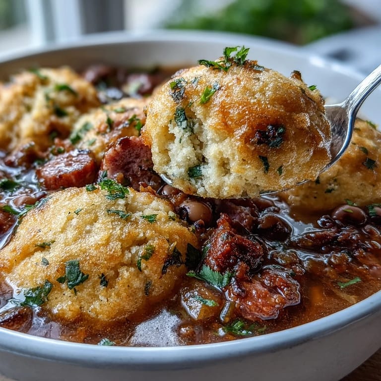 Pin to Board There's something about a pot of black-eyed peas that stops time in a kitchen. My neighbor once knocked on my door on a gray January afternoon, drawn by the smell of smoked sausage and thyme drifting through our shared hallway. When I lifted the lid to show her what I was making, steam rose up and fogged her glasses, and she laughed so hard she had to sit down. That's when I knew this recipe—a humble Southern stew crowned with tender cornmeal dumplings—had something special worth sharing.
