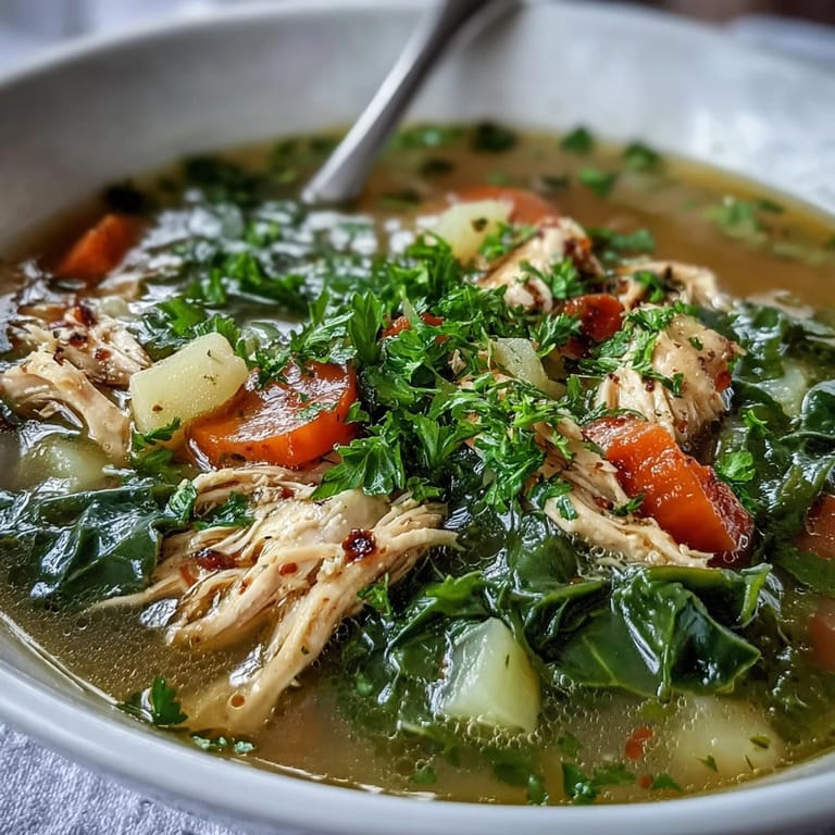 Pin to Board Warm up your soul with this hearty Collard Greens, Chicken and Vegetable Soup. This nourishing dish combines tender shredded chicken, creamy diced potatoes, and vibrant collard greens in a perfectly seasoned broth. Whether you're looking for a wholesome family dinner or a meal-prep staple, this soup delivers comfort in every spoonful.