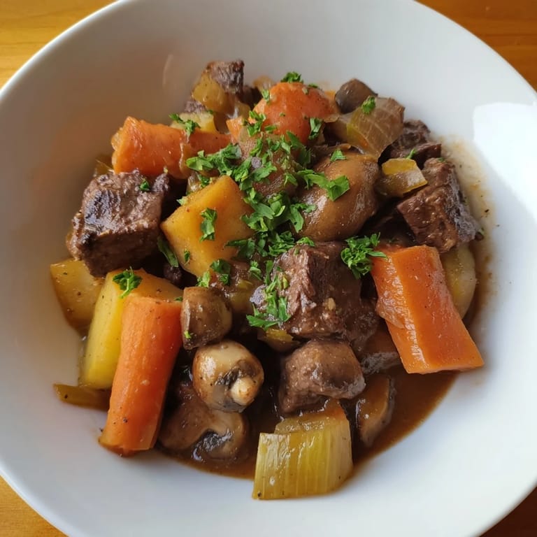 - For the Beef Stew: 2 lbs (900 g) beef chuck, cut into 1½-inch cubes, 2 tbsp olive oil, 1 large yellow onion, diced, 3 cloves garlic, minced, 3 medium carrots, peeled and cut into 1-inch chunks, 2 parsnips, peeled and cut into 1-inch chunks, 2 celery stalks, sliced, 8 oz (225 g) cremini or button mushrooms, quartered, 2 tbsp tomato paste, 1 cup (240 ml) dry red wine, 4 cups (1 L) beef broth, 2 bay leaves, 1 tsp dried thyme, 1 tsp dried rosemary, 2 tsp smoked paprika, 1½ tsp kosher salt (plus more to taste), ½ tsp black pepper, 2 medium Yukon Gold potatoes, cut into 1-inch pieces, 1 tbsp Worcestershire sauce, 1 tbsp cornstarch mixed with 2 tbsp cold water (optional, for thickening), ¼ cup fresh parsley, chopped (for garnish)