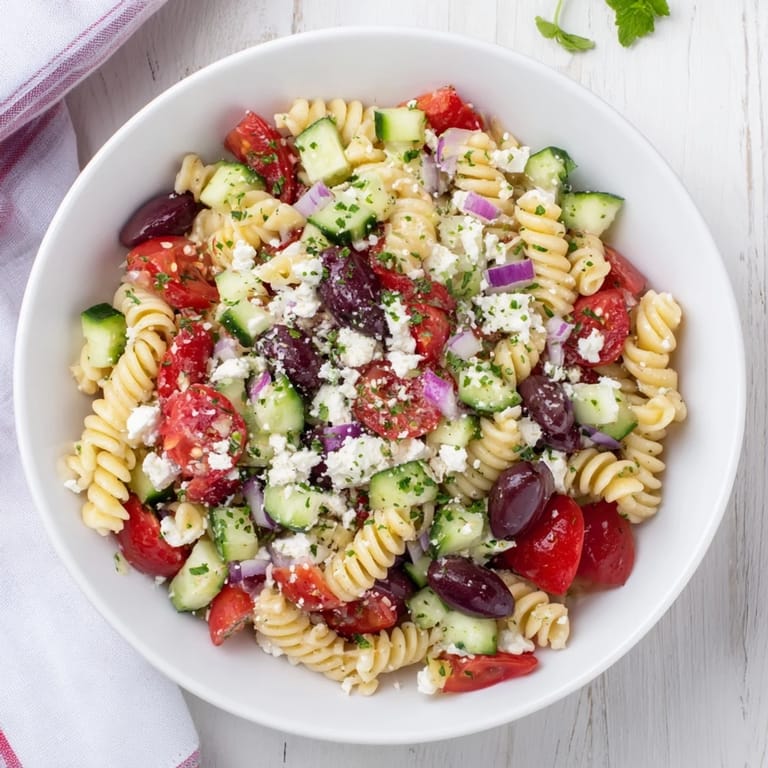 Pin to Board A vibrant, refreshing pasta salad featuring tangy feta, briny olives, ripe tomatoes, and crisp vegetables—all tossed in a zesty olive oil dressing. The perfect light Mediterranean-inspired plate for warm weeknight dinners.