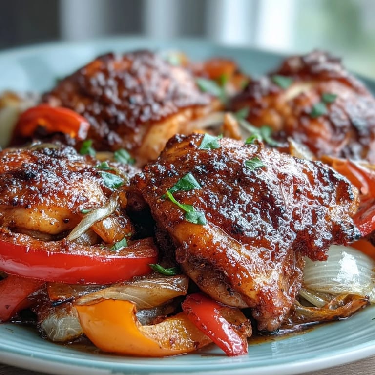 There's a technique here that goes beyond just throwing everything on a sheet pan. The peppers and onions become part of the cooking process for the chicken, absorbing rendered fat and juices that would otherwise be wasted. By the time the chicken is done, the vegetables have softened, caramelized at the edges, and developed this sweet, savory quality that you can't replicate by roasting them separately. The magic is in the arrangement: letting them be a foundation layer that the chicken rests on, not crowded underneath where they'd steam.