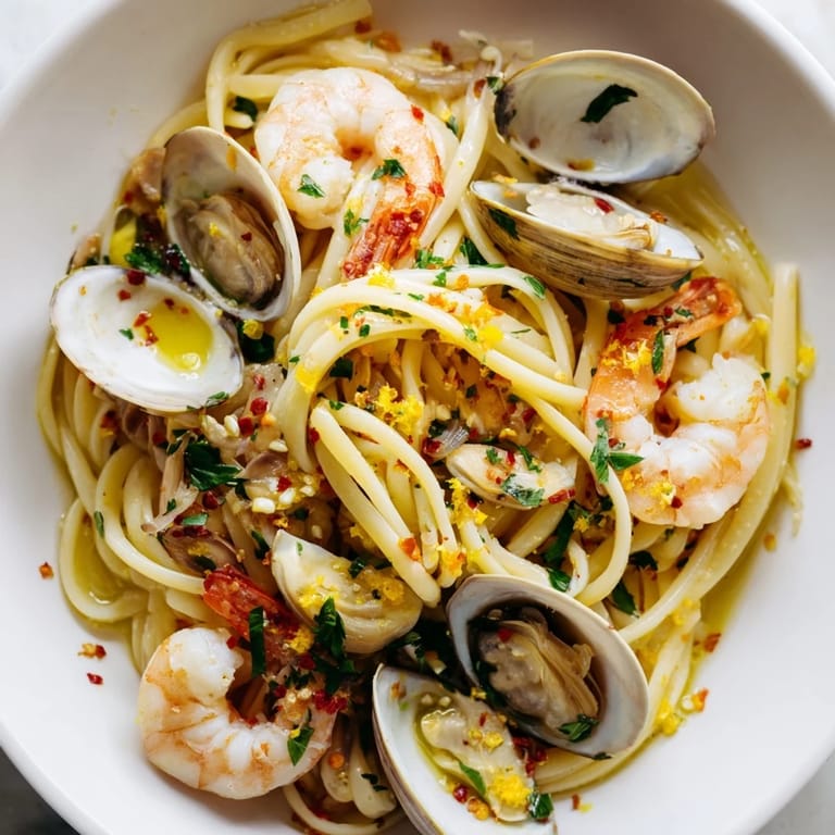Pin to Board I once brought this dish to a friend's dinner party where we ate it standing up in her kitchen because we were too impatient to wait for the table to be cleared. We passed around the lemon wedges and torn bread, trading bites and talking until the pasta had gone cold and no one cared. That's when I realized that aglio e olio—in its seafood form—isn't complicated because it doesn't need to be; the ingredients are speaking louder than any technique.
