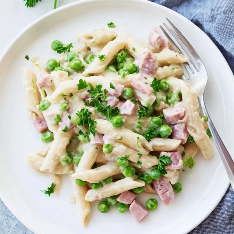 Pin to Board My neighbor knocked on my door one Thursday evening holding a foil-wrapped plate of leftover Easter ham. I had a box of penne in the pantry and a bag of frozen peas in the freezer. What started as a polite thank-you turned into dinner for four, and I've been making this pasta ever since. It's the kind of meal that feels fancy but comes together while you're still in your socks, humming along to the radio.