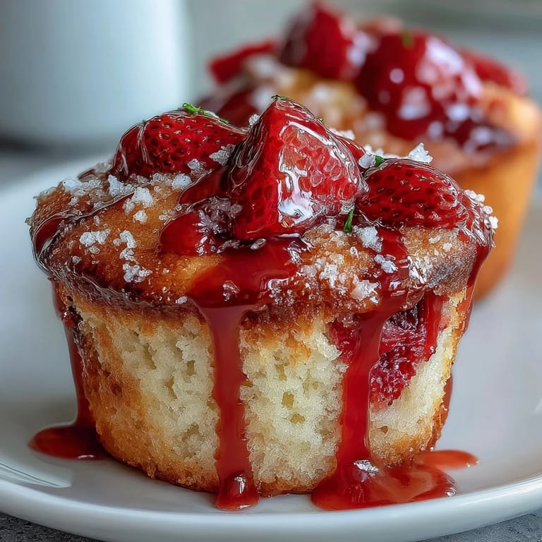 Pin to Board There's something about the smell of strawberries baking that makes a kitchen feel like it's celebrating something. My neighbor brought over a basket of impossibly red berries one June morning, and I had exactly two hours before guests arrived—no time for complexity, just the need to create something that tasted like summer in a muffin form. These strawberry muffins became my answer, and somehow they've stayed that way ever since, reliable and never disappointing.