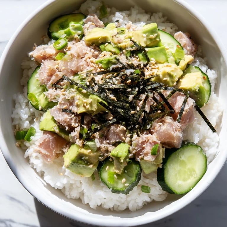 Pin to Board The smell of jasmine rice steaming always takes me straight back to my cramped studio kitchen, where I first threw this bowl together on a Tuesday night when my fridge was nearly empty. I had one can of tuna, half an avocado going soft, and a cucumber I kept forgetting about. What started as a scrappy dinner became something I craved every week. The way the sesame oil clings to warm rice, the cool crunch of cucumber against creamy avocado—it just works.