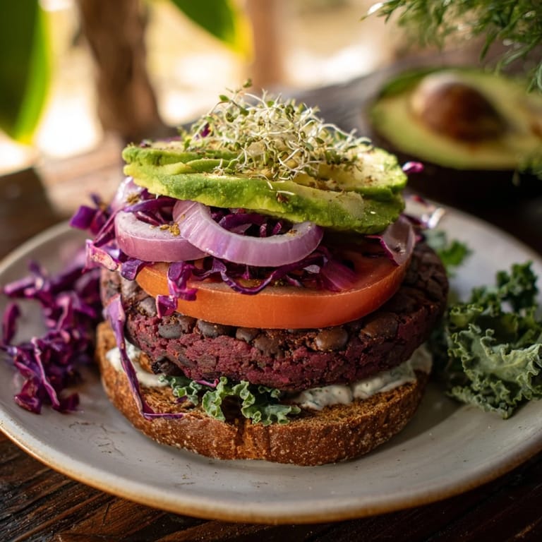 Pin to Board A vibrant, satisfying vegetarian burger bursting with zesty flavors, creamy avocado, and crisp fresh toppings perfect for a quick, wholesome weeknight dinner.
